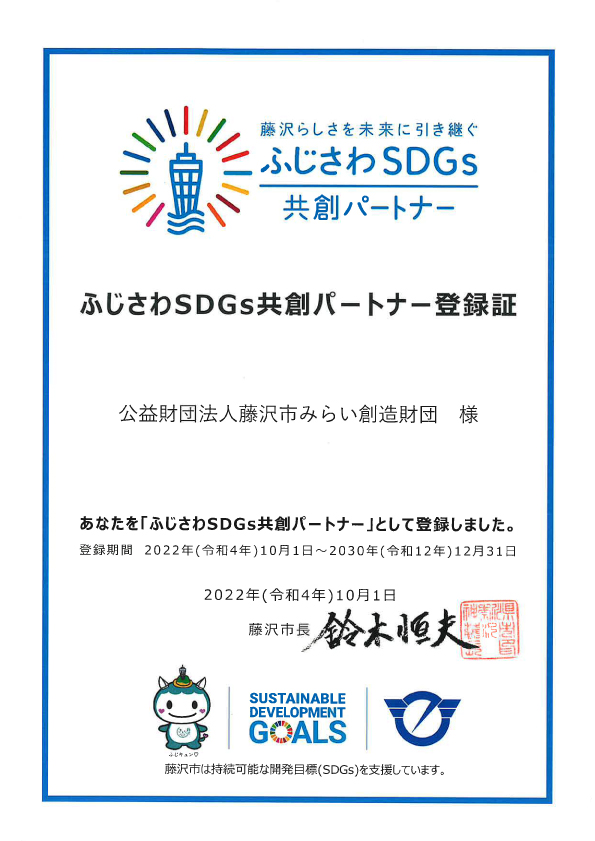 私たち公益財団法人藤沢市みらい創造財団は、SDGsの達成に向けた取り組みを進めながら、市民の皆様へ魅力的な事業を提供いたしますとともに、より一層のサービス向上に努めてまいります。