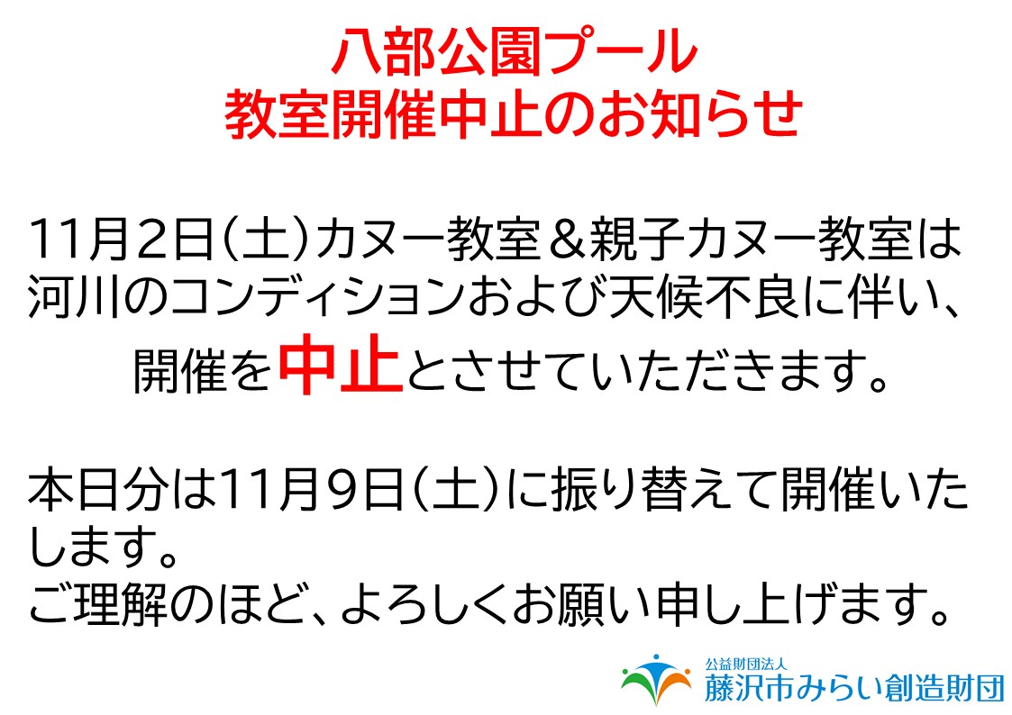 2024年11月2日 / 最終更新日 : 2024年11月2日 kugenuma スポーツ事業 【八部公園プール】カヌー教室、親子カヌー教室 開催中止のお知らせ 日頃より八部公園をご利用いただきましてありがとうございます。 河川のコンディションおよび天候不良のため、2024年11月2日(土)「カヌー教室」「親子カヌー教室」 を中止とさせていただきます。 本日分につきましては、11月9日(土)に振り替えて開催させていただきます。 ご迷惑をお掛けいたしますが、ご理解ご協力の程よろしくお願いいたします。 Tweet クリックして印刷 (新しいウィンドウで開きます) 印刷