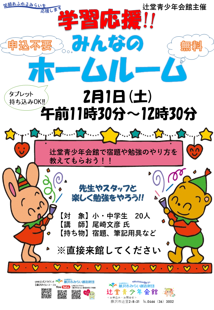 辻堂青少年会館「学習応援~みんなのホームルーム~ 2月」開催のお知らせ