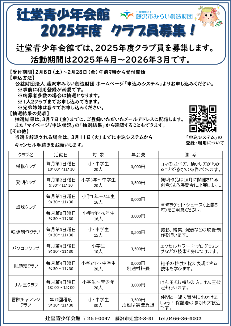 辻堂青少年会館 2025年度 クラブ員募集のお知らせ