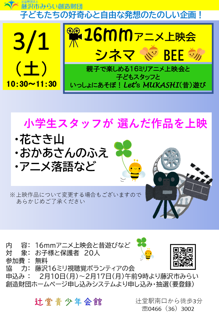 2025/02/05 イベント募集青少年事業辻堂青少年会館 辻堂青少年会館「16mmアニメ上映会」3月のお知らせ 日時 3月1日(土) 午前10時30分~11時30分 場所 辻堂青少年会館 内容 小学生スタッフが選んだ作品を上映 対象 お子様と保護者20人 申込み 2月10日(月)~2月17日(月)午前9時から藤沢みらい創造財団ホームページの申込システムから申込・抽選(要登録) https://f-mirai.jp/web 問い合わせ 辻堂青少年会館 電話:(36)3002 カテゴリ イベント募集青少年事業辻堂青少年会館 前へ 辻堂青少年会館「子育てママのパソコン講座 3月(全2回シリーズ) 」 次へ 辻堂青少年会館「つじりんパークであそぼう ぴーか・ぶー 3月 」お知らせ より良いウェブサイトにするためにみなさまのご意見をお聞かせください 質問:このページの内容は参考になりましたか? 参考になったふつう参考にならなかった 質問:このページの内容はわかりやすかったですか? わかりやすかったふつうわかりにくかった 質問:このページは見つけやすかったですか? 見つけやすかったふつう見つけにくかった