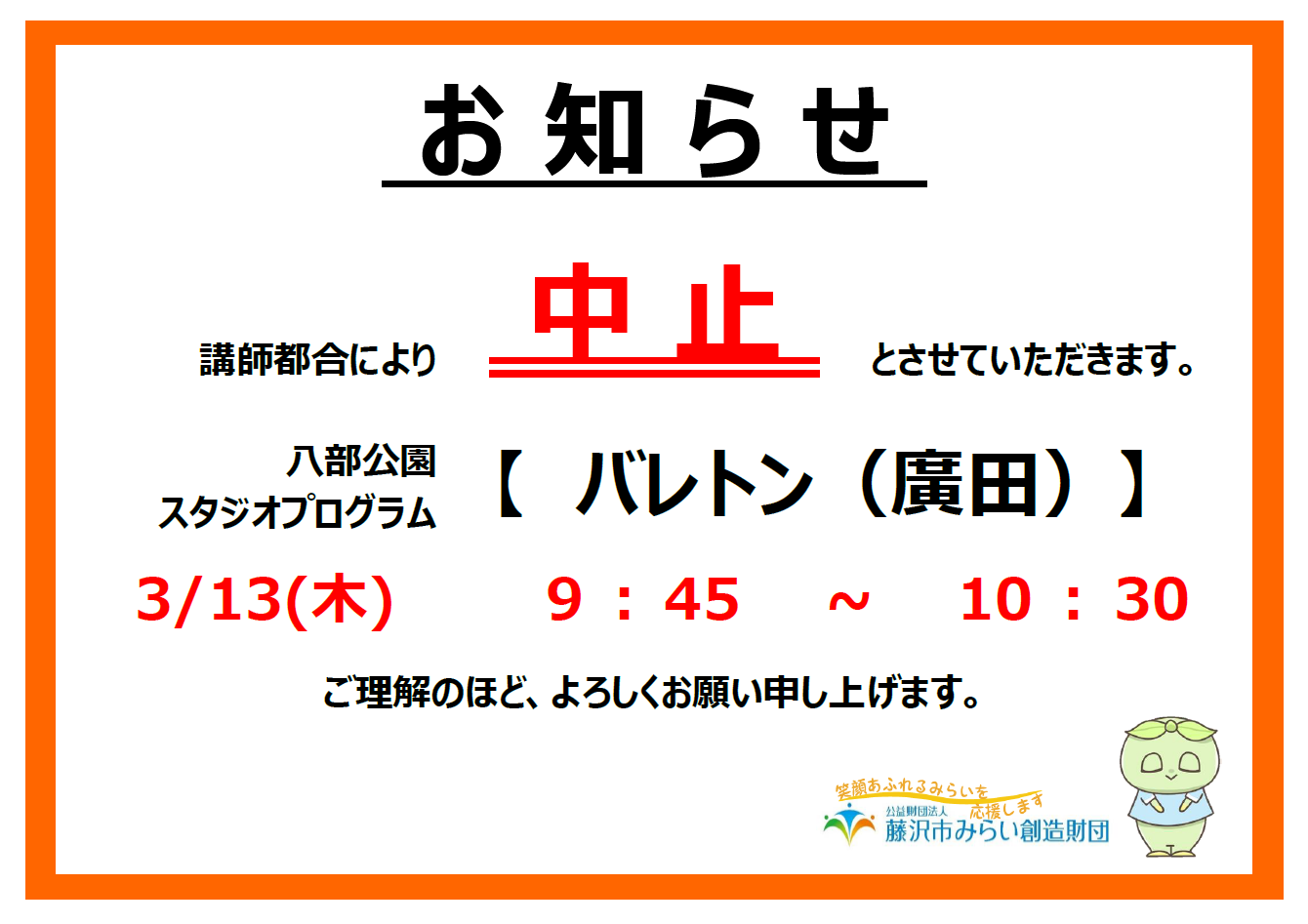 2024年12月25日 / 最終更新日 : 2025年3月11日 kugenuma スポーツ事業 八部公園スタジオプログラム「バレトン:廣田」中止のお知らせ 日頃より八部公園をご利用いただきましてありがとうございます。 講師の都合により、12/26(木)「バレトン」(講師:廣田) を中止とさせていただきます。 ご迷惑をお掛けいたしますが、ご理解ご協力の程よろしくお願いいたします。 Tweet クリックして印刷 (新しいウィンドウで開きます) 印刷