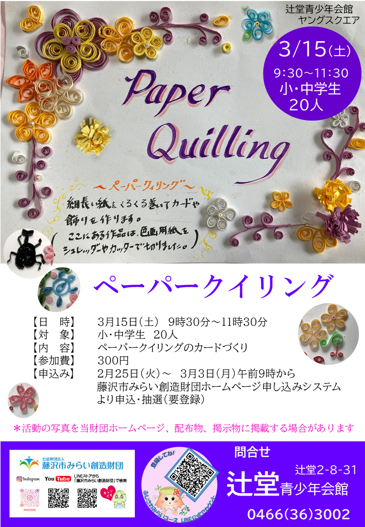 2025/02/10 イベント募集青少年事業辻堂青少年会館 辻堂青少年会館「ペーパークイリング」 日時 3月15日(土)午前9時30分~11時30分 場所 辻堂青少年会館 内容 ペーパークイリング 対象 小・中学生20人 費用 300円 申込み 2月25日(火)~3月3日(月)午前9時から藤沢市みらい創造財団ホームページの申込システムから申込・抽選(要登録) https://f-mirai.jp/web 問い合わせ 辻堂青少年会館 電話:(36)3002 カテゴリ イベント募集青少年事業辻堂青少年会館 前へ 【募集】藤沢青少年会館 臨時職員(会館指導員) 次へ ワンコイン・コンサート2025 ~春のキッズソングコンサート~ より良いウェブサイトにするためにみなさまのご意見をお聞かせください 質問:このページの内容は参考になりましたか? 参考になったふつう参考にならなかった 質問:このページの内容はわかりやすかったですか? わかりやすかったふつうわかりにくかった 質問:このページは見つけやすかったですか? 見つけやすかったふつう見つけにくかった