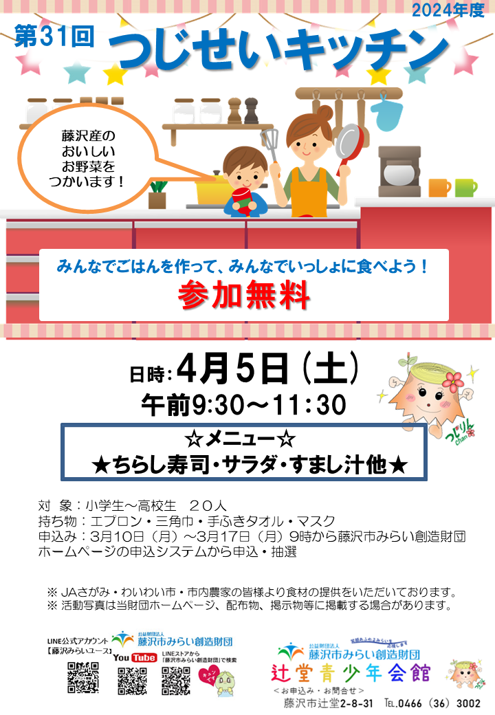 3月10日(月)~3月17日(月) 午前9時から藤沢市みらい創造財団ホームページの申込システムから申込・抽選