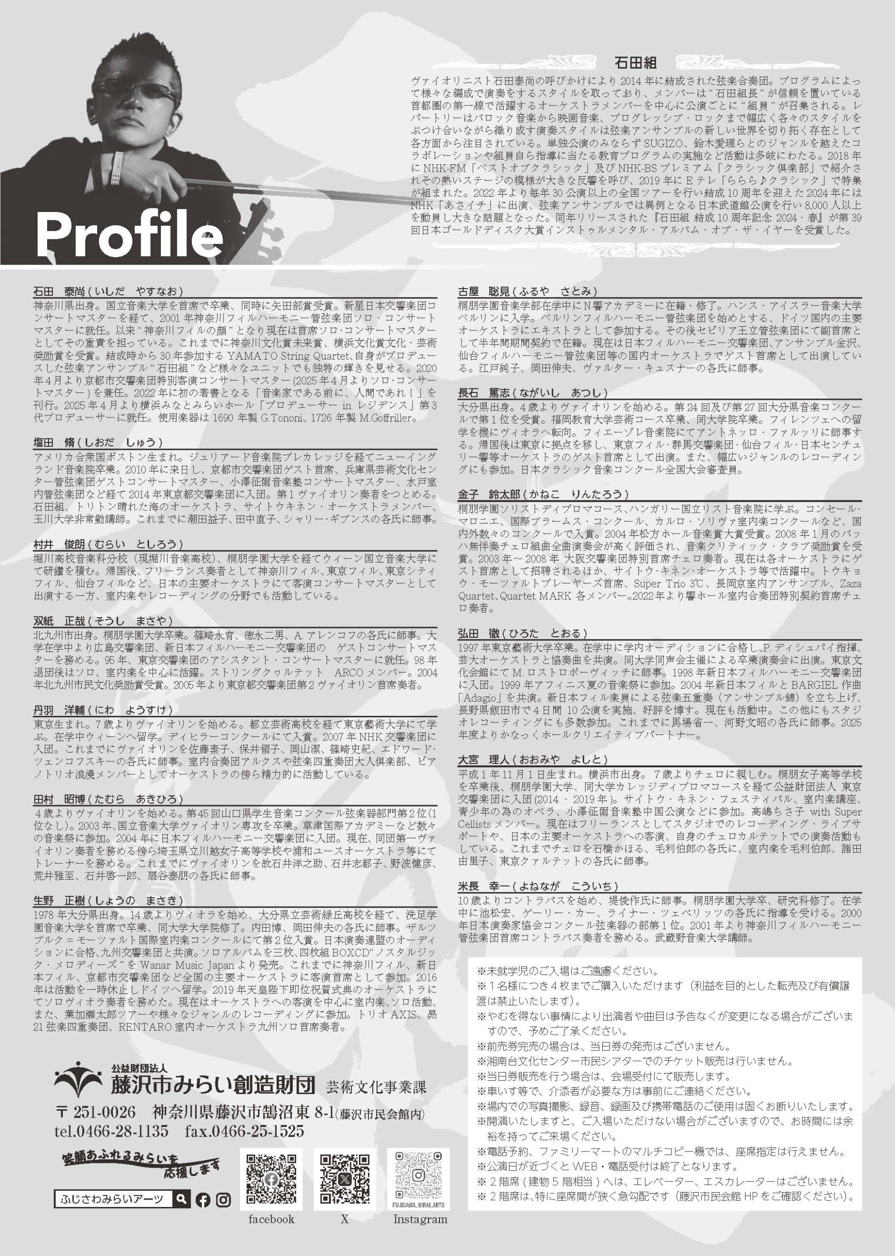 ヴァイオリニスト石田泰尚の呼びかけにより2014年に結成された弦楽合奏団。石田泰尚が信頼を置く一線で活躍しているオーケストラメンバーを中心に、公演ごとに編成されます。かつて藤沢ジュニアオーケストラに所属していた石田泰尚の藤沢凱旋公演をお見逃しなく!!