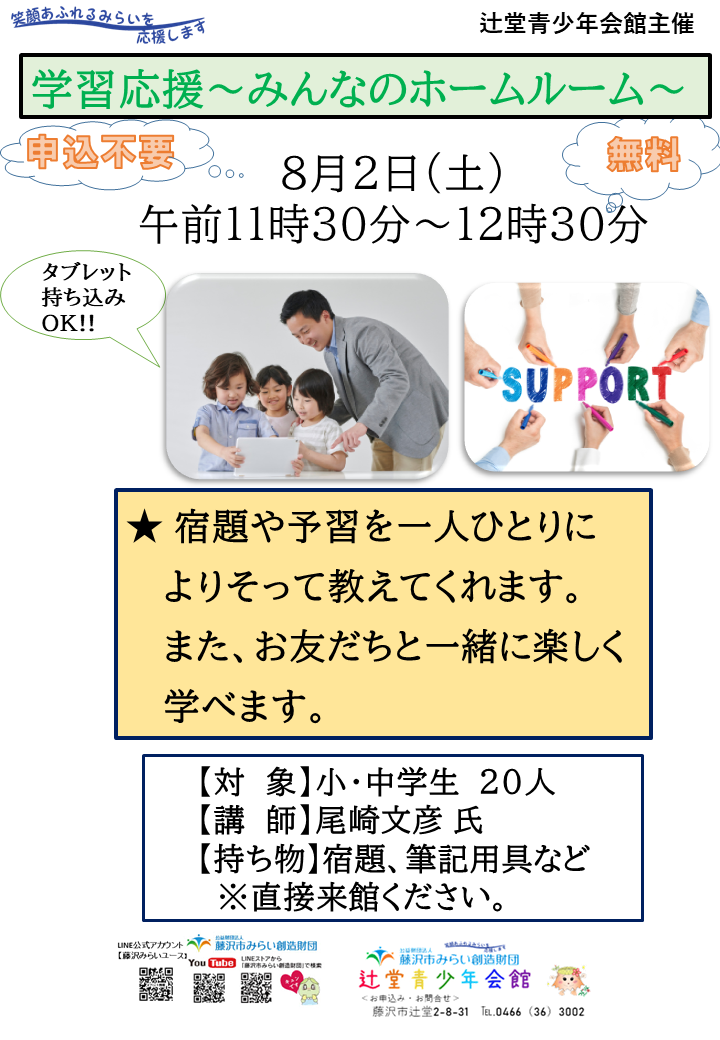 辻堂青少年会館「学習応援~みんなのホームルーム~ 8月」開催のお知らせ