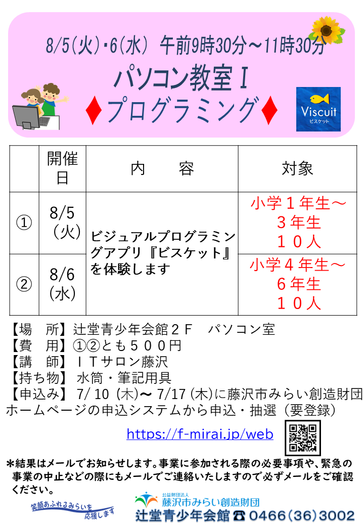 7月10日(木)~7月17日(木)午前9時から藤沢市みらい創造財団ホームページの申込システムから申込・抽選(要登録)