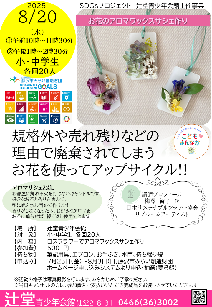 辻堂青少年会館 SDGsプロジェクト「お花のアロマワックスサシェ作り」