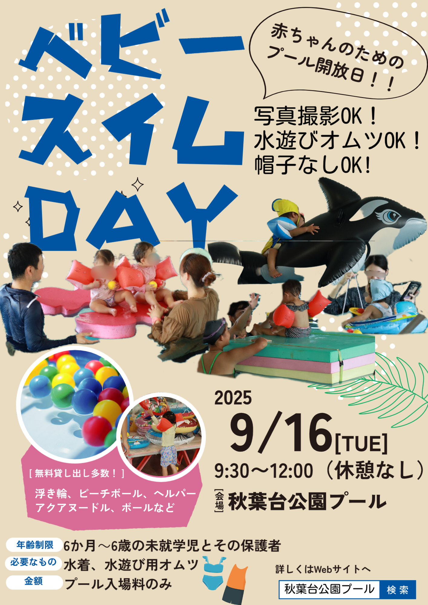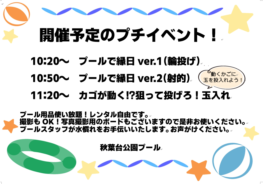 参加方法:申込不要です。直接秋葉台公園プールまでお越しください。