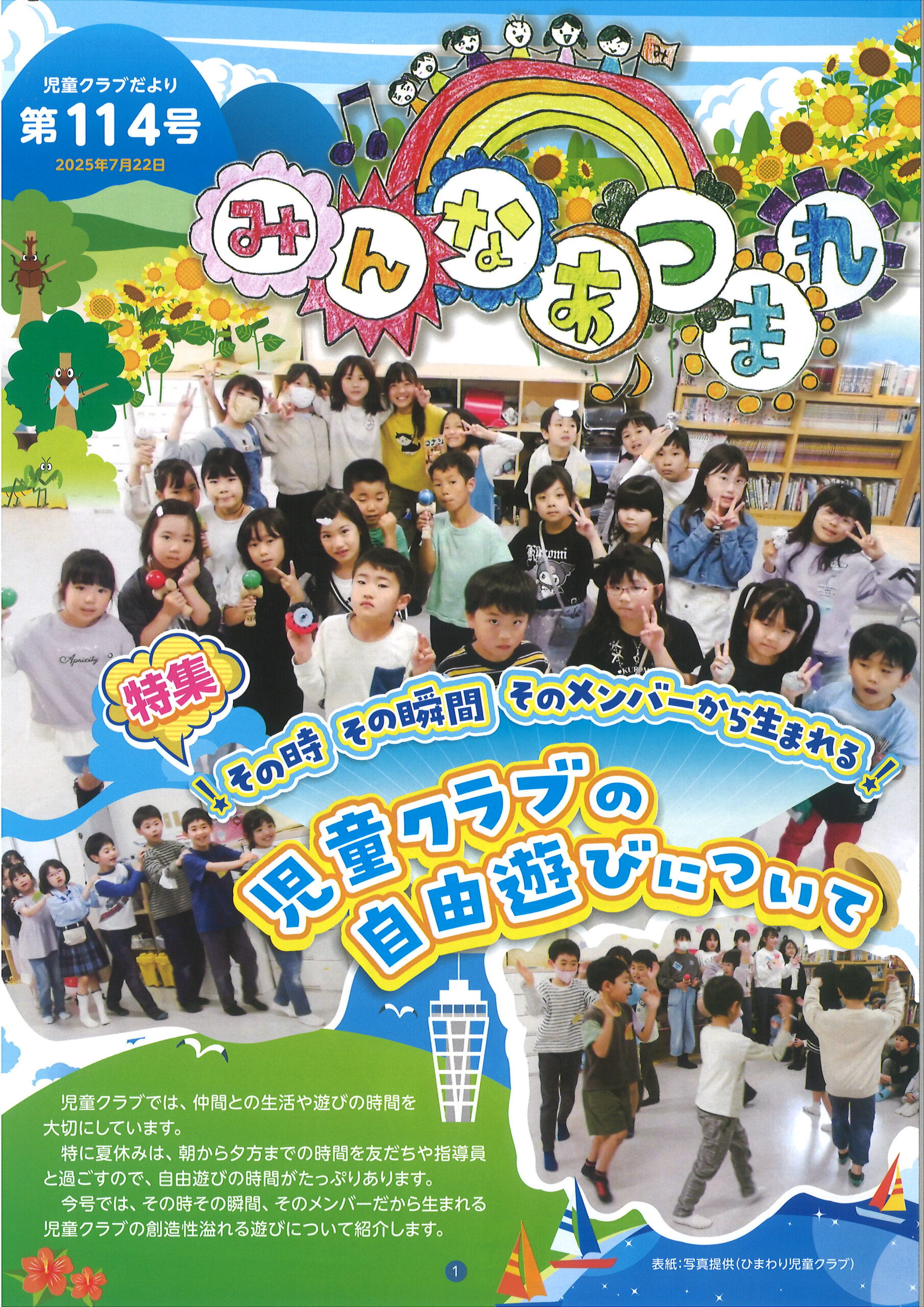 2025/08/01 児童クラブクラブだより 第114号 ~その時 その瞬間 そのメンバーから生まれる~ 児童クラブの自由遊びについて 児童クラブ定期刊行物 「みんなあつまれ 第114号」 2025年7月22日発行日発 カテゴリ 児童クラブクラブだより 前へ 児童クラブ集会 次へ 2025年度 児童クラブの夏休み より良いウェブサイトにするためにみなさまのご意見をお聞かせください 質問:このページの内容は参考になりましたか? 参考になったふつう参考にならなかった 質問:このページの内容はわかりやすかったですか? わかりやすかったふつうわかりにくかった 質問:このページは見つけやすかったですか? 見つけやすかったふつう見つけにくかった