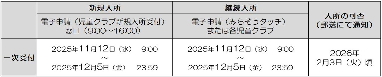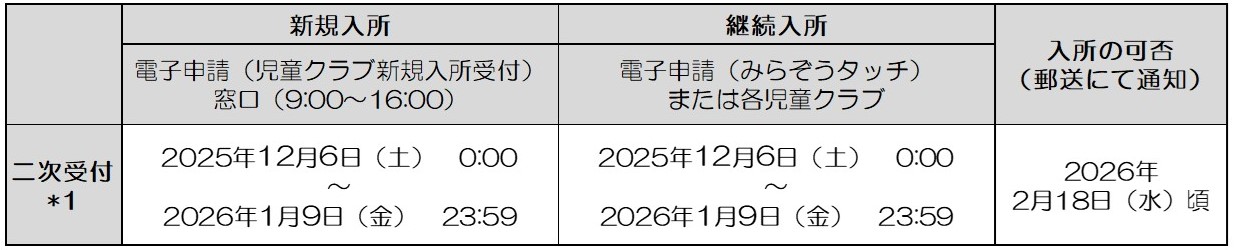 *1 二次受付の方は一次選考終了後、定員(受入可能人数)に空きがある児童クラブのみ、