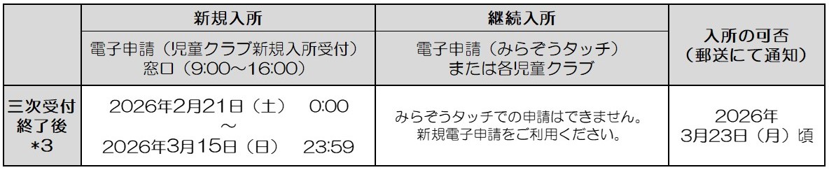 *3 三次受付終了後の方は、定員(受入可能人数)に空きがある児童クラブのみ、
