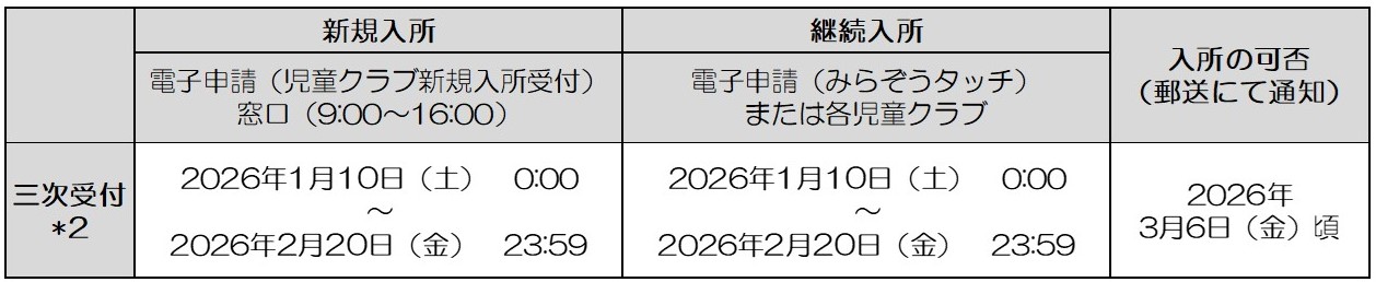 *2 三次受付の方は二次選考終了後、定員(受入可能人数)に空きがある児童クラブのみ、