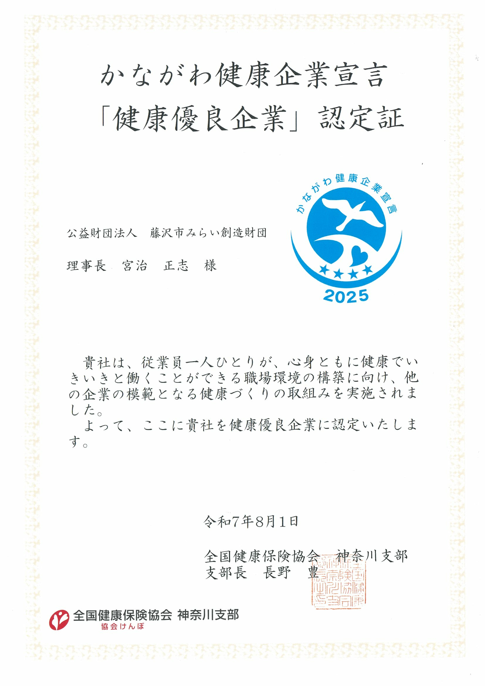 2025/08/19 財団運営全般 かながわ健康企業宣言『★4健康優良認定』を受けました 今後も従業員一人ひとりが、健康でいきいきと働くことができる職場づくりに積極的に取り組んでまいります。 かながわ健康企業宣言『健康優良企業認定』とは 『健康優良企業認定』とは、かながわ健康企業宣言に参加している事業所の健康づくりの取組みを、協会けんぽ神奈川支部が「健康優良企業」または「健康づくり取組み企業」として認定するものです。 カテゴリ 財団運営全般 前へ Fujisawa MIRAI.net No.42 次へ 2025年統合管理・IT資産管理サーバ機器等賃貸借契約書類一式ダウンロード より良いウェブサイトにするためにみなさまのご意見をお聞かせください 質問:このページの内容は参考になりましたか? 参考になったふつう参考にならなかった 質問:このページの内容はわかりやすかったですか? わかりやすかったふつうわかりにくかった 質問:このページは見つけやすかったですか? 見つけやすかったふつう見つけにくかった
