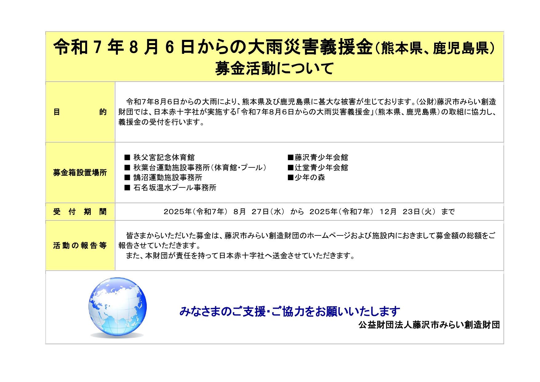 令和7年8月6日からの大雨により、熊本県及び鹿児島県に甚大な被害が生じております。(公財)藤沢市みらい創造財団では、日本赤十字社が実施する「令和7年8月6日からの大雨災害義援金」(熊本県、鹿児島県)の取組に協力し、救援金の受付を行います。