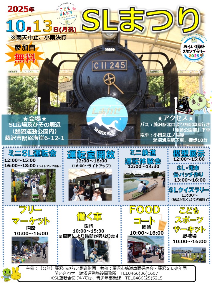 ミニSL運転会、運転室開放、ミニ鉄道運転体験会、模型展示、缶バッチ作り、SLクイズラリーについては→藤沢市みらい創造財団青少年事業担当(TEL:0466-25-5215)