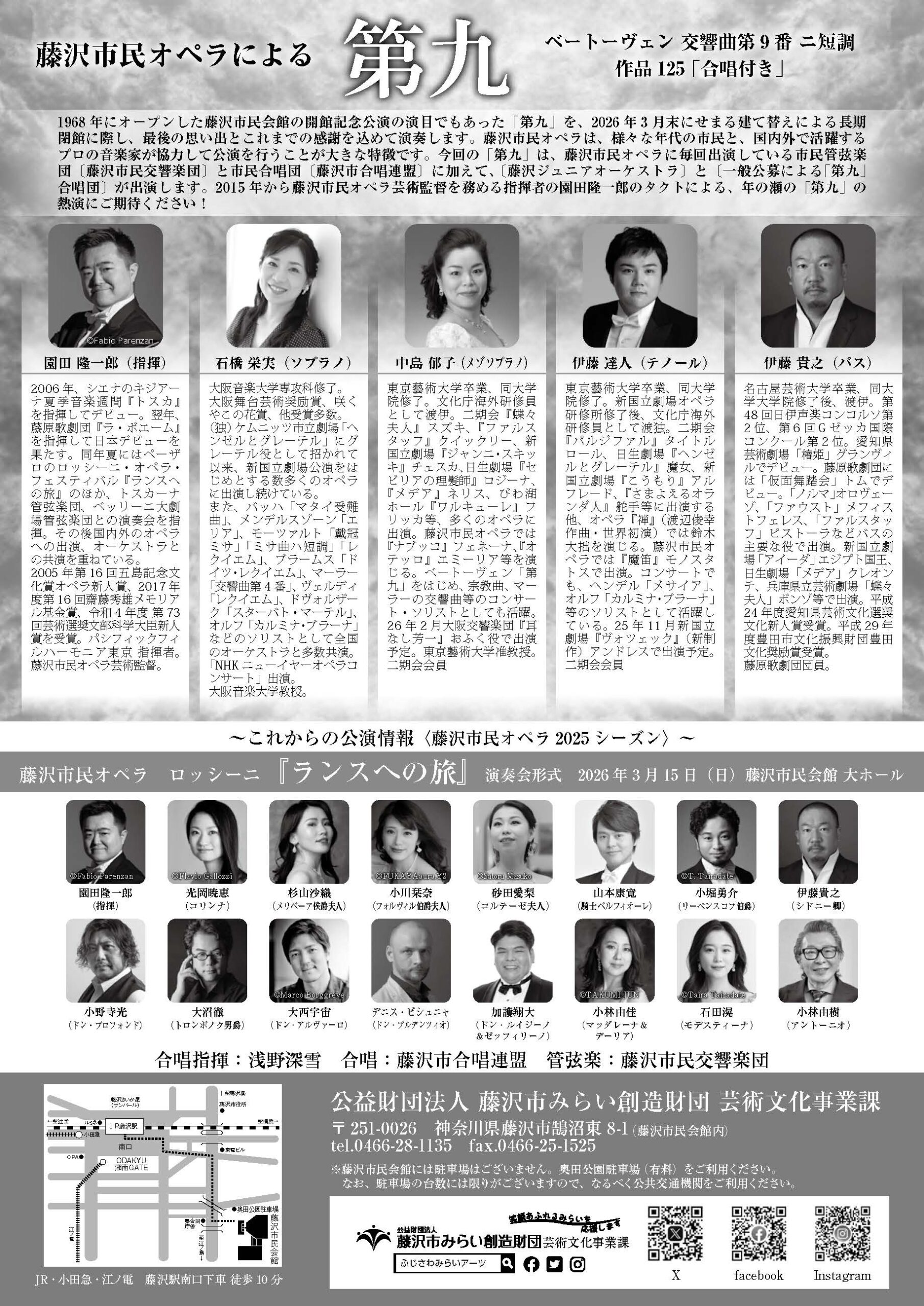 1968 年にオープンした藤沢市民会館の開館記念公演の演目でもあった「第九」を、2026 年3 月末にせまる建て替えによる長期閉館に際し、最後の思い出とこれまでの感謝を込めて演奏します。藤沢市民オペラは、様々な年代の市民と、国内外で活躍するプロの音楽家が協力して公演を行うことが大きな特徴です。今回の「第九」は、藤沢市民オペラに毎回出演している市民管弦楽団〔藤沢市民交響楽団〕と市民合唱団〔藤沢市合唱連盟〕に加えて、〔藤沢ジュニアオーケストラ〕と〔一般公募による「第九」合唱団〕が出演します。2015 年から藤沢市民オペラ芸術監督を務める指揮者の園田隆一郎のタクトによる、年の瀬の「第九」の熱演にご期待ください!