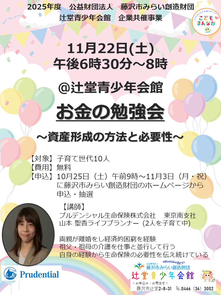 2025/10/22 イベント募集青少年事業辻堂青少年会館 辻堂青少年会館「◆ 企業共催事業~お金の勉強会~ ◆」 日時 11月22日(土) 午後6時30分~午後8時 場所 辻堂青少年会館 内容 子育て世代のお金の勉強会 ~資産形成の方法と必要性~ 対象 子育て世代 10人 費用 無料 申込み 10月25日(土)午前9時~11月3日(月・祝)に藤沢市みらい創造財団ホームページから申込・抽選 https://f-mirai.jp/web 問い合わせ 辻堂青少年会館 電話:(36)3002 カテゴリ イベント募集青少年事業辻堂青少年会館 前へ 辻堂青少年会館「ヤングスクエア ~木箱のリメイク~ 」開催のお知らせ 次へ 申込開始!【11/24】サイクルチャレンジ藤沢 in 秋葉台 より良いウェブサイトにするためにみなさまのご意見をお聞かせください 質問:このページの内容は参考になりましたか? 参考になったふつう参考にならなかった 質問:このページの内容はわかりやすかったですか? わかりやすかったふつうわかりにくかった 質問:このページは見つけやすかったですか? 見つけやすかったふつう見つけにくかった