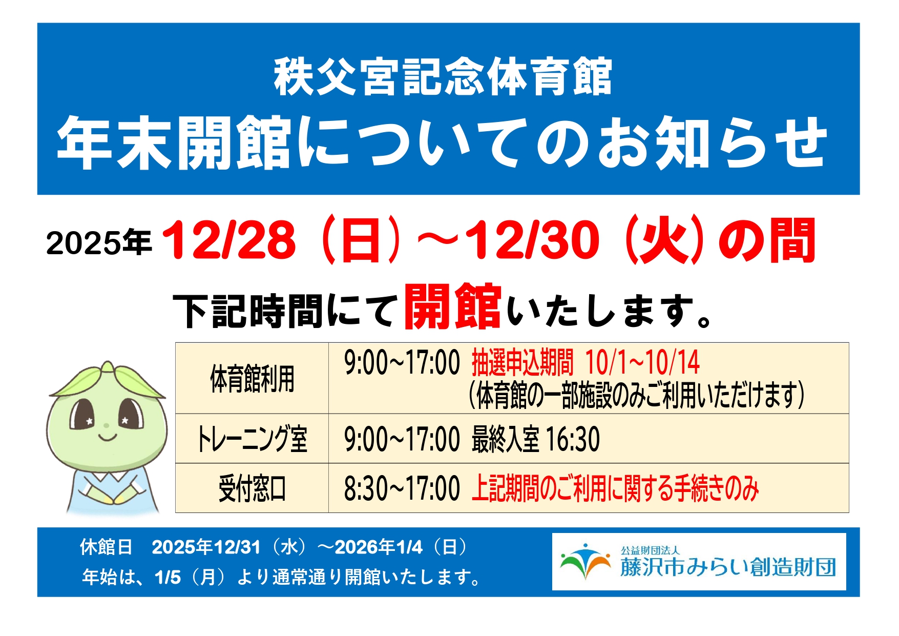 ※12月28日(日)~12月30日(火)の利用についての抽選申込期間は、10月1日(水)~10月14日(火)となります。