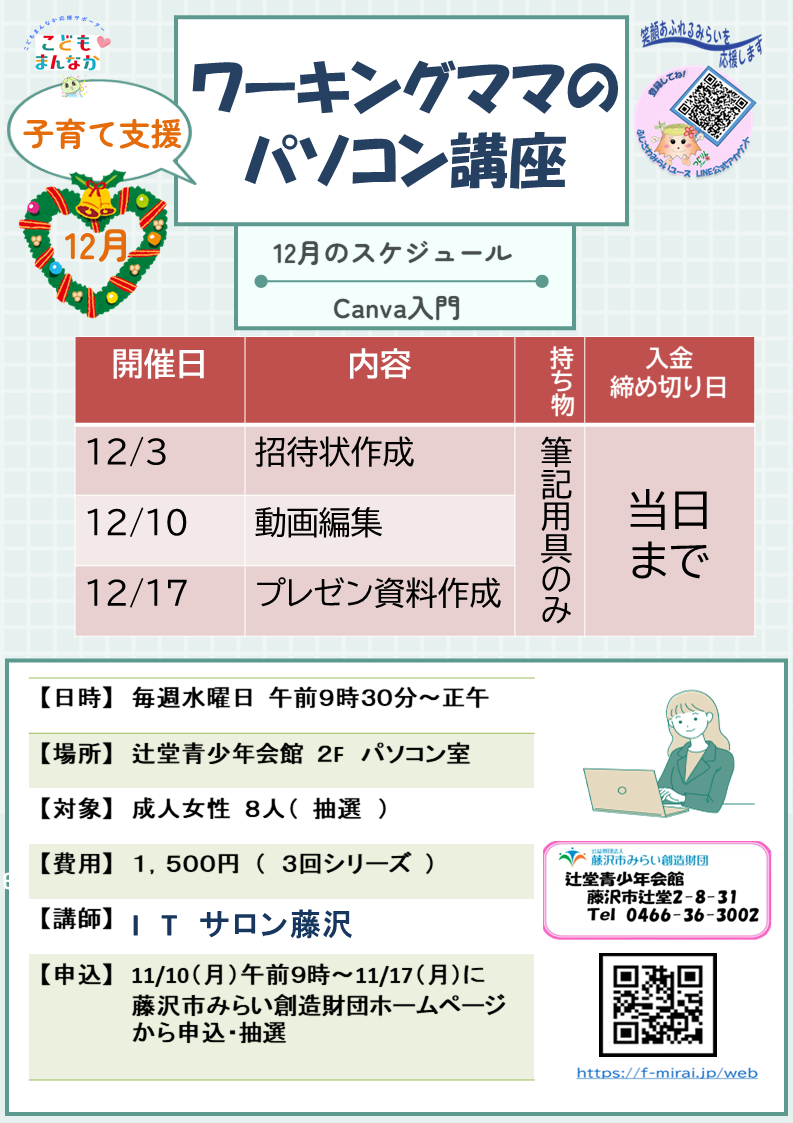 辻堂青少年会館「ワーキングママのパソコン講座 12月 (全3回) 」