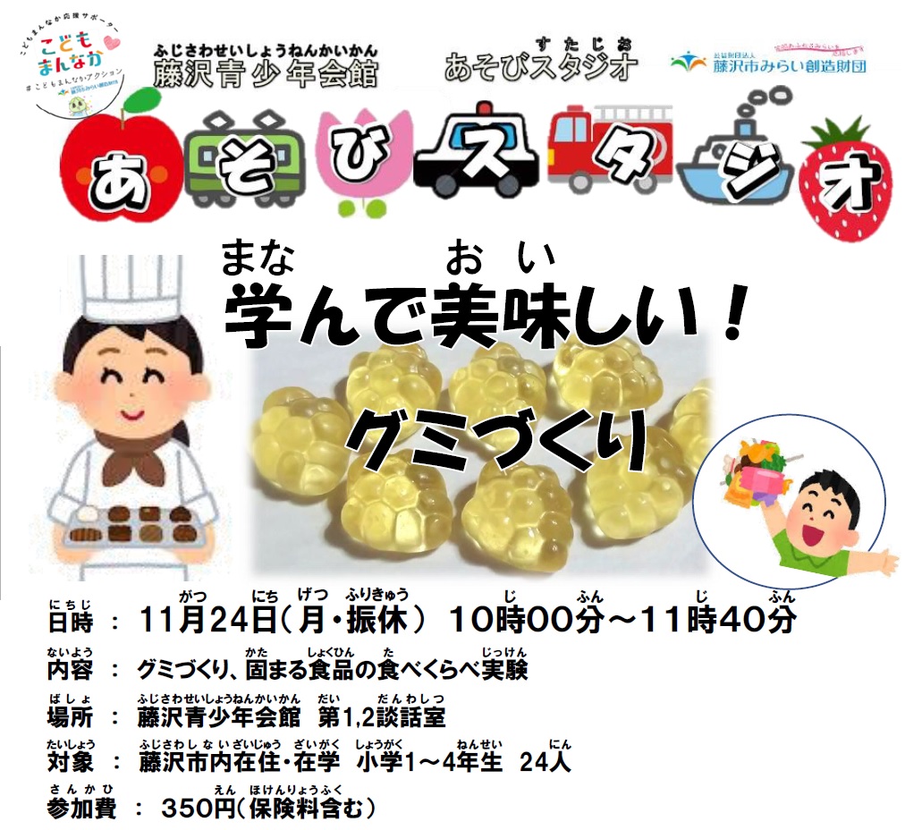 藤沢青少年会館「あそびスタジオ 11月 学んで美味しい!グミづくり」参加者募集