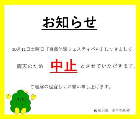 2025/10/10 青少年事業藤沢市少年の森 【少年の森】「自然体験フェスティバル」10月11日(土)中止のお知らせ 日頃より少年の森をご利用いただきましてありがとうございます。 下記、イベントは雨天のため、【中止】とさせていただきます。 ご迷惑をおかけいたしますが、ご理解のほどよろしくお願いいたします。 少年の森 0466-48-7234 カテゴリ 青少年事業藤沢市少年の森 前へ 「第27回藤沢市親子ふれあいコンサート」開催のご案内 次へ 森の音楽会/森のフリーマーケット/サンデープレーパーク より良いウェブサイトにするためにみなさまのご意見をお聞かせください 質問:このページの内容は参考になりましたか? 参考になったふつう参考にならなかった 質問:このページの内容はわかりやすかったですか? わかりやすかったふつうわかりにくかった 質問:このページは見つけやすかったですか? 見つけやすかったふつう見つけにくかった