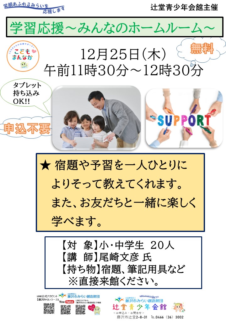 2025/11/21 イベントイベント開催情報イベント参加者募集青少年事業辻堂青少年会館 辻堂青少年会館「学習応援~みんなのホームルーム~ 12月」開催のお知らせ 日時 12月25日 (木) 午前11時30分~12時30分 場所 辻堂青少年会館 内容 みんなと楽しく勉強会 (宿題フォロー等) *課題・宿題・疑問点がありましたら持参ください。 対象 小・中学生 20人 費用 無料 持ち物 宿題、筆記用具など 講師 自分ラボ 尾崎文彦 氏 申込 不要 問い合わせ 辻堂青少年会館 電話:0466(36)3002 カテゴリ イベントイベント開催情報イベント参加者募集青少年事業辻堂青少年会館 前へ 藤沢青少年会館「あそびスタジオ 12月 楽しい☆クリスマス」参加者募集 次へ 辻堂青少年会館「クリスマスのつどい」開催のお知らせ より良いウェブサイトにするためにみなさまのご意見をお聞かせください 質問:このページの内容は参考になりましたか? 参考になったふつう参考にならなかった 質問:このページの内容はわかりやすかったですか? わかりやすかったふつうわかりにくかった 質問:このページは見つけやすかったですか? 見つけやすかったふつう見つけにくかった