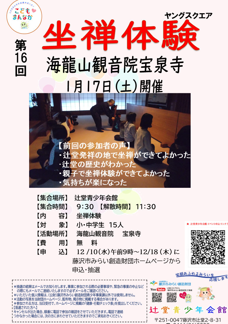 2025/12/08 イベントイベント開催情報イベント参加者募集青少年事業辻堂青少年会館 辻堂青少年会館 ◆ 坐禅体験 ◆ 2026. 1月 場所 海龍山観音院 宝泉寺 *集合・解散:辻堂青少年会館 日時 1月17日(土) 午前9時30分~11時30分 対象 小・中学生 15人 内容 坐禅体験 申込 12月10日(水)午前9時~12月18日(木)に藤沢市みらい創造財団ホームページから申込・抽選 問合せ 辻堂青少年会館 電話:0466-36-3002 カテゴリ イベントイベント開催情報イベント参加者募集青少年事業辻堂青少年会館 前へ 辻堂青少年会館「つじりんとあそぼう!ぴーか・ぶー 1月 」お知らせ 次へ 辻堂青少年会館「つじせいもったいないネット 1月」 より良いウェブサイトにするためにみなさまのご意見をお聞かせください 質問:このページの内容は参考になりましたか? 参考になったふつう参考にならなかった 質問:このページの内容はわかりやすかったですか? わかりやすかったふつうわかりにくかった 質問:このページは見つけやすかったですか? 見つけやすかったふつう見つけにくかった