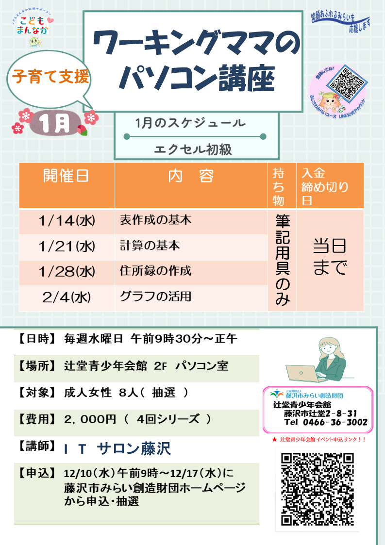 辻堂青少年会館「ワーキングママのパソコン講座 1月 (全4回) 」