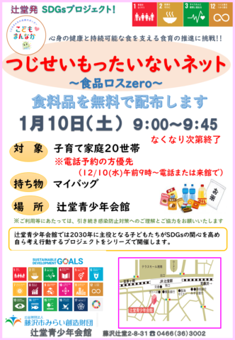 2025/12/08 イベントイベント開催情報イベント参加者募集青少年事業辻堂青少年会館 辻堂青少年会館「つじせいもったいないネット 1月」 日時 1月10日(土) 午前9時~9時45分 場所 辻堂青少年会館 内容 精米と食品の無料配布 持ち物 マイバッグ 対象 子育て家庭20世帯 先着順 *電話予約の方優先 申込み 12月10日(水) 午前9時より電話または来館にて(先着順) 問い合わせ 辻堂青少年会館 電話:0466‐36‐3002 カテゴリ イベントイベント開催情報イベント参加者募集青少年事業辻堂青少年会館 前へ 辻堂青少年会館 ◆ 坐禅体験 ◆ 2026. 1月 次へ 辻堂青少年会館 ★ 鏡開き ★ 1月 開催のお知らせ より良いウェブサイトにするためにみなさまのご意見をお聞かせください 質問:このページの内容は参考になりましたか? 参考になったふつう参考にならなかった 質問:このページの内容はわかりやすかったですか? わかりやすかったふつうわかりにくかった 質問:このページは見つけやすかったですか? 見つけやすかったふつう見つけにくかった
