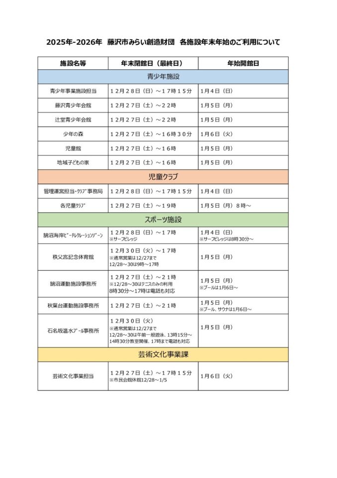 2025/12/09 青少年事業児童クラブスポーツ事業芸術文化事業 2025年ー2026年各施設の年末年始ご利用について カテゴリ 青少年事業児童クラブスポーツ事業芸術文化事業 前へ 辻堂青少年会館「ワーキングママのパソコン講座 1月 (全4回) 」 次へ 森のお仕事withドラム缶ピザ より良いウェブサイトにするためにみなさまのご意見をお聞かせください 質問:このページの内容は参考になりましたか? 参考になったふつう参考にならなかった 質問:このページの内容はわかりやすかったですか? わかりやすかったふつうわかりにくかった 質問:このページは見つけやすかったですか? 見つけやすかったふつう見つけにくかった