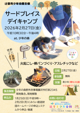 2026/01/15 イベントイベント開催情報イベント参加者募集青少年事業辻堂青少年会館 辻堂青少年会館 サードプレイス~デイキャンプ~ 日時 2月27日(金)午前10時30~午後4時 場所 藤沢市少年の森(集合・解散) 内容 火おこし・棒パン作り・アスレチック など 対象 青少年(概ね30歳ぐらいまで) 20人 費用 無料 申込み 2026年1月25日(日)午前9時~2月2日(月)に藤沢市みらい創造財団ホームページから申込・抽選 申し込みシステム 登録・利用案内 問い合わせ 辻堂青少年会館 電話:(36)3002 カテゴリ イベントイベント開催情報イベント参加者募集青少年事業辻堂青少年会館 前へ 菜の花キャンプ 次へ ワンコイン・コンサートvol.3 ~和楽器の世界へようこそ~ より良いウェブサイトにするためにみなさまのご意見をお聞かせください 質問:このページの内容は参考になりましたか? 参考になったふつう参考にならなかった 質問:このページの内容はわかりやすかったですか? わかりやすかったふつうわかりにくかった 質問:このページは見つけやすかったですか? 見つけやすかったふつう見つけにくかった