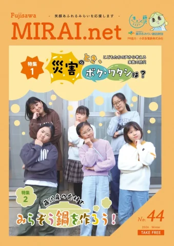 2026/01/20 広報誌財団運営全般 Fujisawa MIRAI.net No.44 特集1「災害のとき、ボク・ワタシは? こどもたちの声から考える家族の防災」 特集2「藤沢産の食材でみらぞう鍋を作ろう!」 特集1の「ハザードマップ」と「安全のてびき」はこちらからダウンロードをどうぞ♪ カテゴリ 広報誌財団運営全般 前へ 年末年始のご挨拶 次へ 藤沢市秩父宮記念体育館施設総合管理業務委託書類一式ダウンロード より良いウェブサイトにするためにみなさまのご意見をお聞かせください 質問:このページの内容は参考になりましたか? 参考になったふつう参考にならなかった 質問:このページの内容はわかりやすかったですか? わかりやすかったふつうわかりにくかった 質問:このページは見つけやすかったですか? 見つけやすかったふつう見つけにくかった