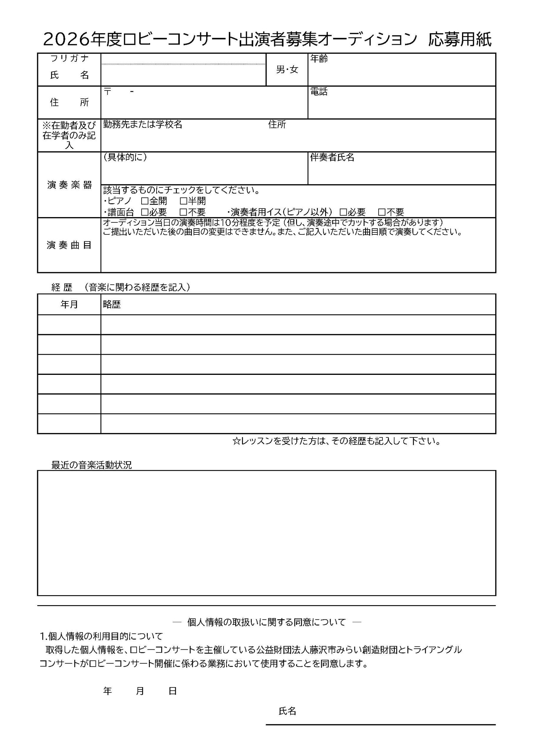 専門的に音楽を修得(音楽大学卒業等に準ずる)し、現在も演奏活動をしている藤沢市内在住、在勤、在学の方。