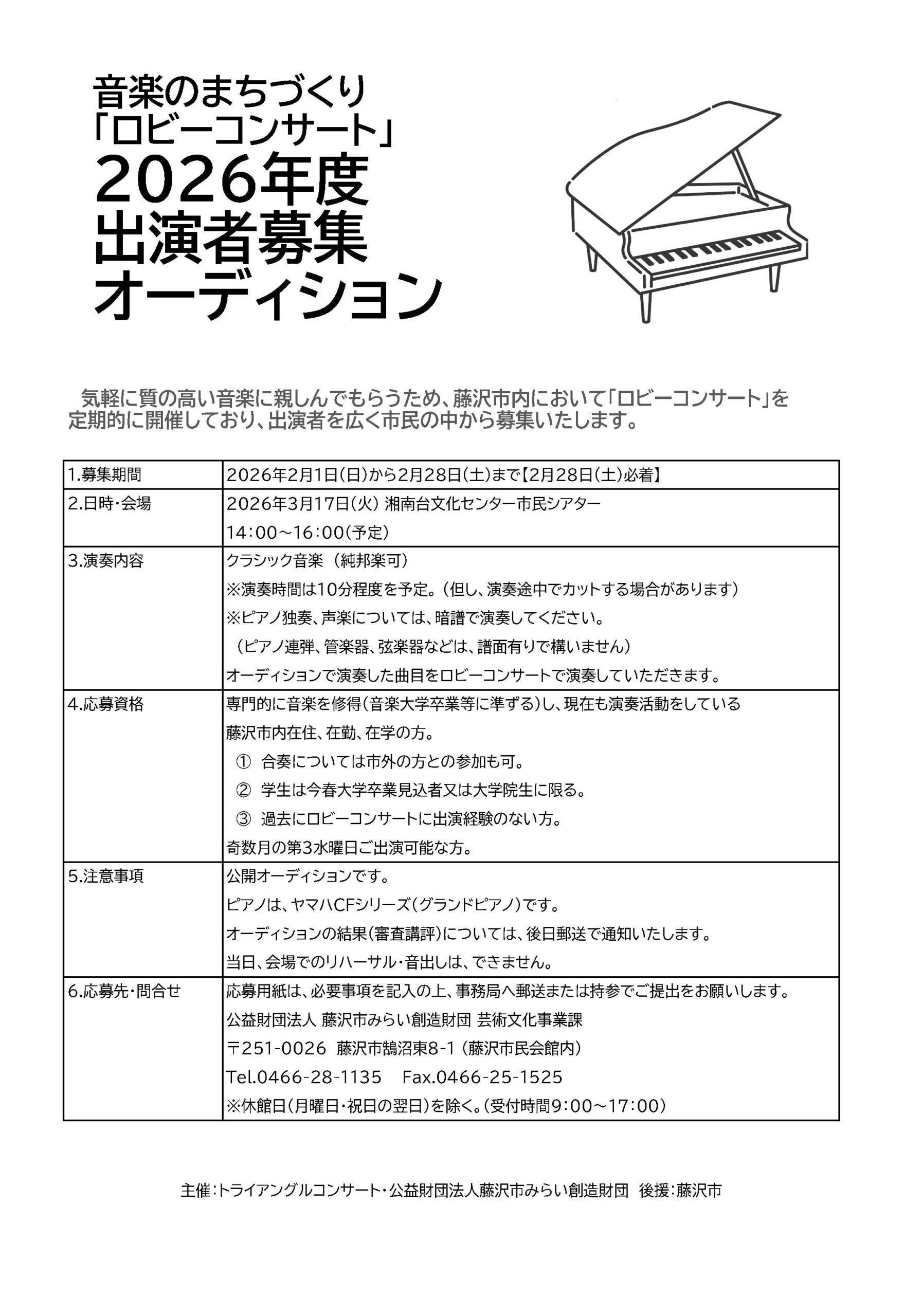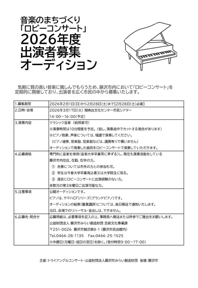 音楽のまちづくり「ロビーコンサート」2026出演者募集オーディション
