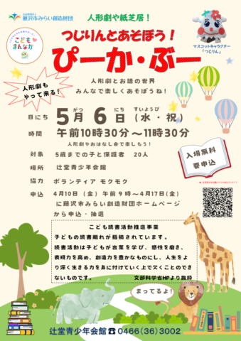 2026/04/05 イベントイベント開催情報イベント参加者募集青少年事業辻堂青少年会館 辻堂青少年会館「つじりんとあそぼう!ぴーか・ぶー 5月 」お知らせ 場所 辻堂青少年会館 2階 談話室 日時 5月6日(水・祝) 午前10時30分~11時30分 対象 5歳までの子と保護者 20人 内容 人形劇 他 協力 ボランティア モクモク 申込み 4月10日(火)午前9時~4月17日(金) に藤沢市みらい創造財団ホームページから申込・抽選 問い合わせ 辻堂青少年会館 電話:0466-36-3002 カテゴリ イベントイベント開催情報イベント参加者募集青少年事業辻堂青少年会館 前へ 辻堂青少年会館「★ Happy Mother’s day ★」 次へ 辻堂青少年会館「ヤングスクエア ~保冷剤を使ってボトルアート作り~ 」開催のお知らせ より良いウェブサイトにするためにみなさまのご意見をお聞かせください 質問:このページの内容は参考になりましたか? 参考になったふつう参考にならなかった 質問:このページの内容はわかりやすかったですか? わかりやすかったふつうわかりにくかった 質問:このページは見つけやすかったですか? 見つけやすかったふつう見つけにくかった