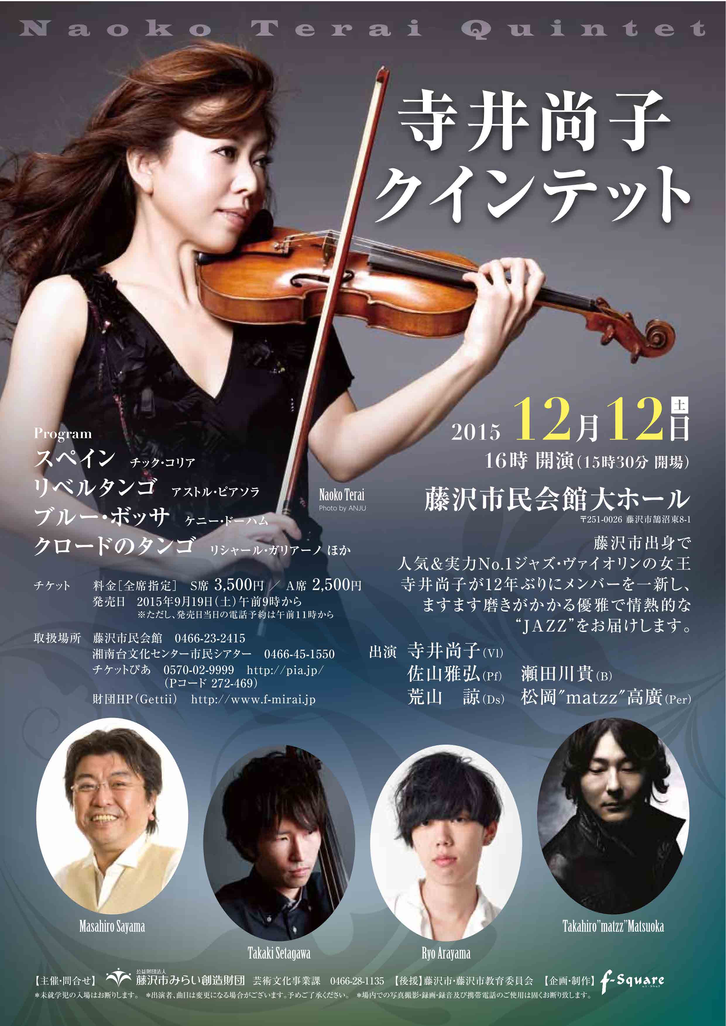 藤沢市出身で人気&実力No.1ジャズ・ヴァイオリンの女王「寺井尚子」が12年ぶりにメンバーを一新し、ますます磨きがかかる優雅で情熱的なJAZZをお届けします。