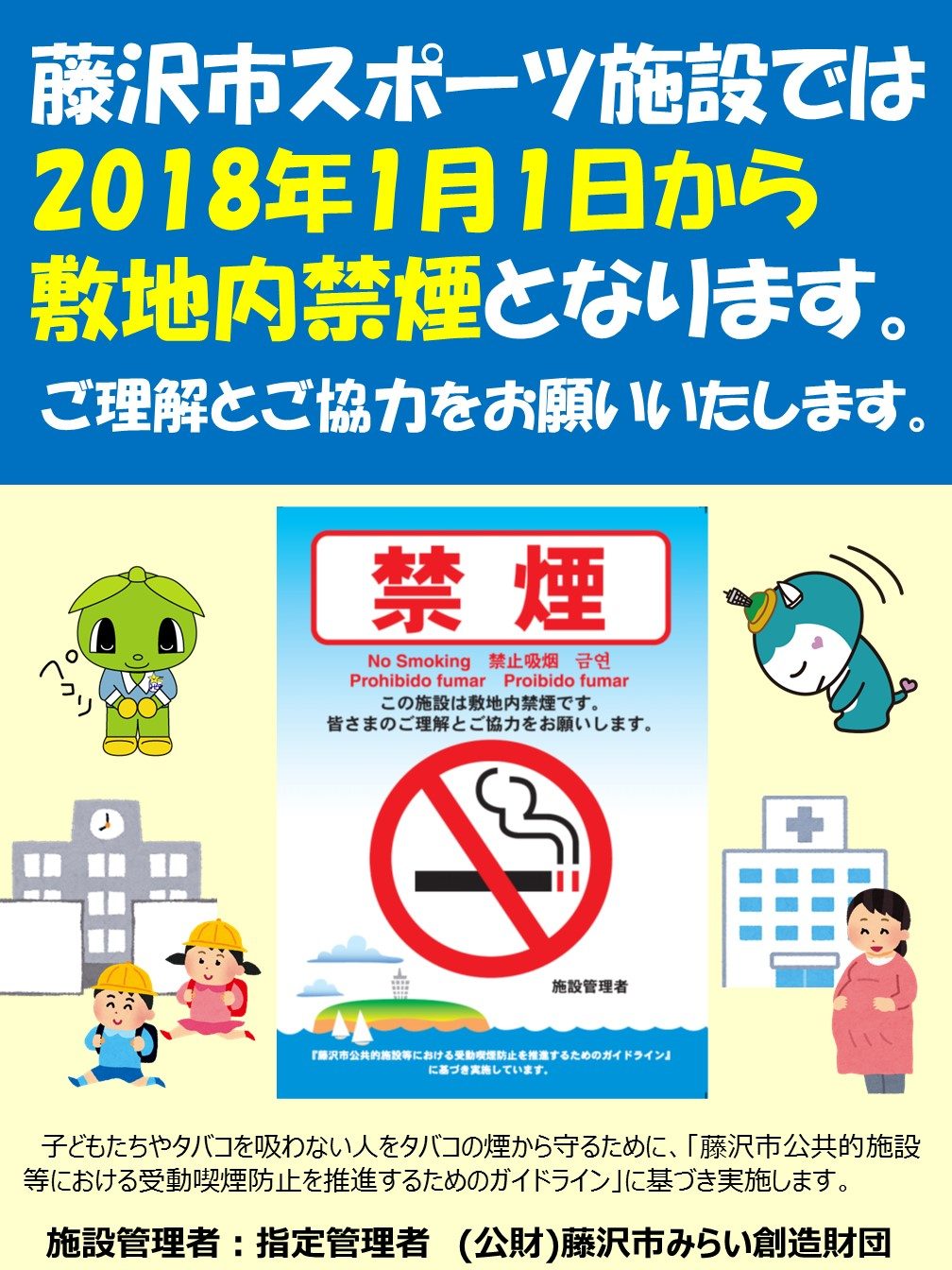 2017年10月4日 / 最終更新日 : 2020年8月5日 zigyou スポーツ事業 【クローズアップ】スポーツ施設敷地内禁煙のお知らせ 藤沢市の「藤沢市公共的施設等における受動喫煙防止を推進するためのガイドライン」に基づき、 本財団が管理するスポーツ施設(秩父宮記念体育館、八部公園、秋葉台公園、石名坂温水プール、各スポーツ広場)では、2018年1月1日より敷地内禁煙となります。 利用者皆様のご理解とご協力をお願いいたします。 Tweet クリックして印刷 (新しいウィンドウで開きます) 印刷