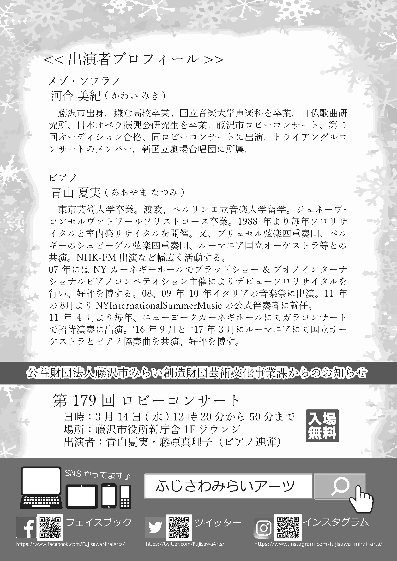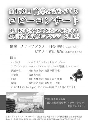 気軽に音楽に親しんでいただくため、藤沢市役所新館1Fロビーにおいて無料のロビーコンサートを定期的に開催していましたが、2018年1月より藤沢市役所新庁舎1Fラウンジに場所をかえて開催することになりました。どうぞお楽しみに♫