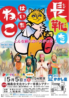 今年の湘南台文化センター市民シアターの5月5日の“こどもの日”は、劇団かかし座の「長靴をはいたねこ」をお送りいたします。