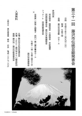 藤沢市文化団体連合会加盟舞台部門六団体(邦楽・謡曲・三曲・吟詠・民謡民舞・日本舞踊)が、日本の伝統芸能を継承するため、一生懸命に努力をし、皆様方にご披露申し上げます。ご来場頂き、多くの市民の方々に興味を持っていただき、育てて下さりますようお願い申し上げます。