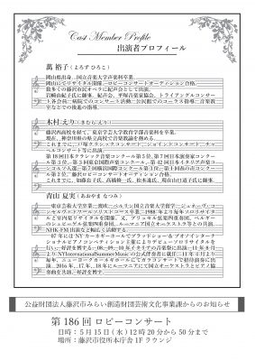 岩崎由紀子氏に師事。紀声会、平塚音楽家協会、トライアングルコンサート各会員。病院でのコンサート活動。公民館でのコーラス指導。音楽教室などでの後進の指導。[/su_column]