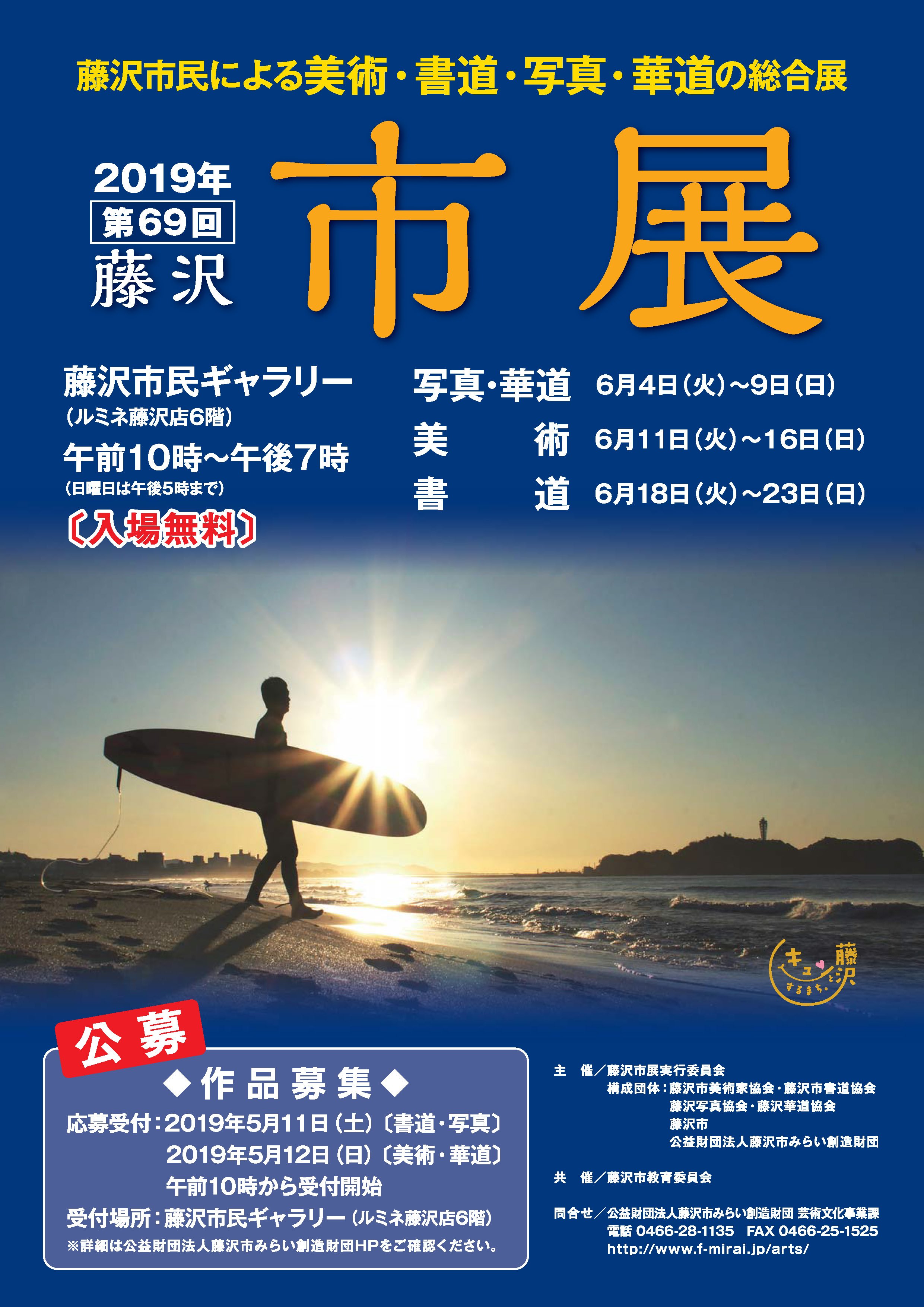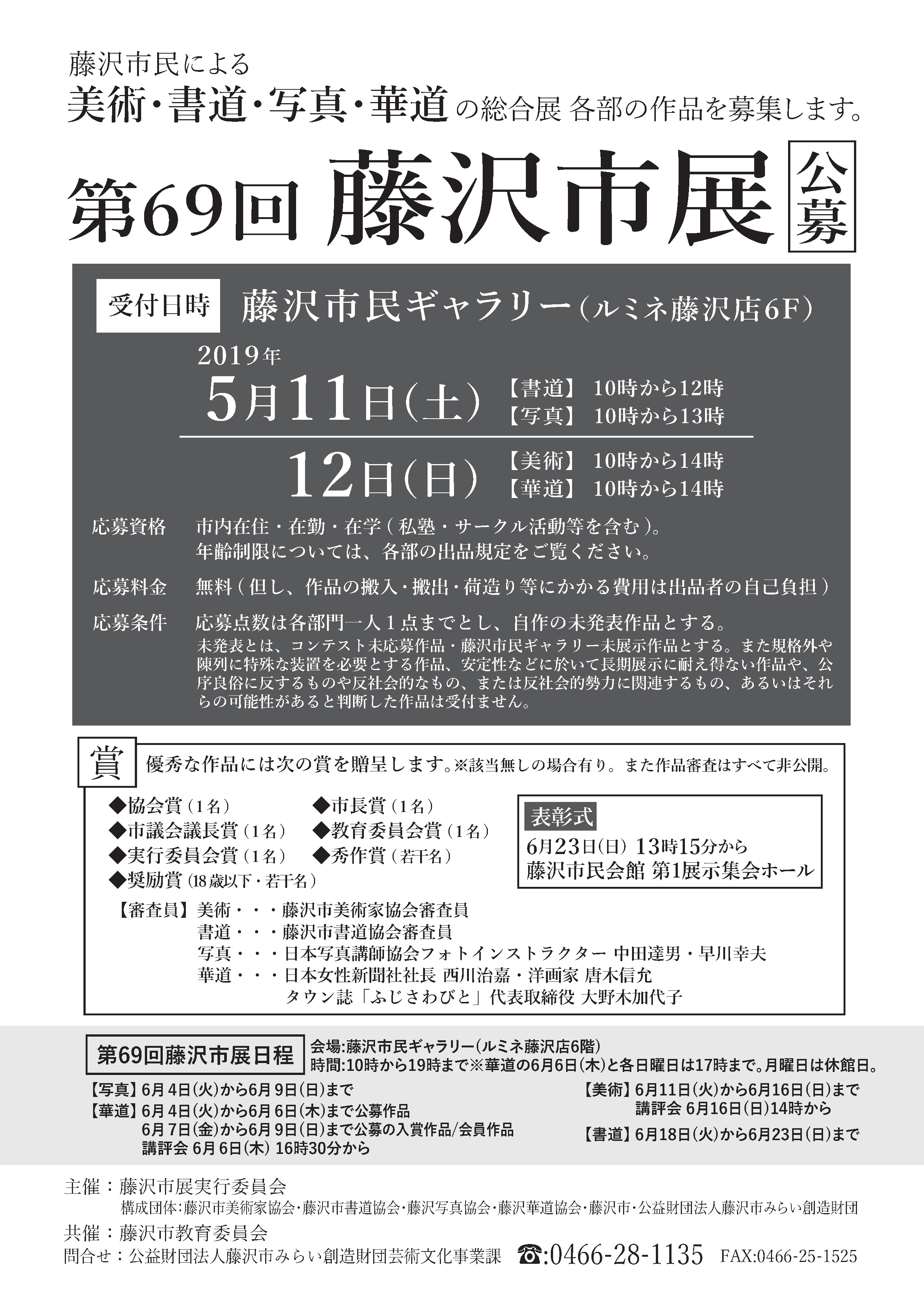 今年も「第69回藤沢市展」を開催するにあたり美術・書道・写真・華道の各部作品募集を行います。