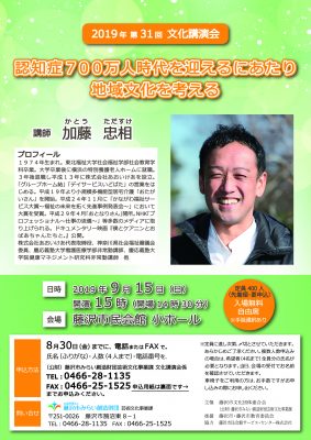 今年の文化講演会のテーマは「認知症700万人時代を迎えるにあたり地域文化を考える」
