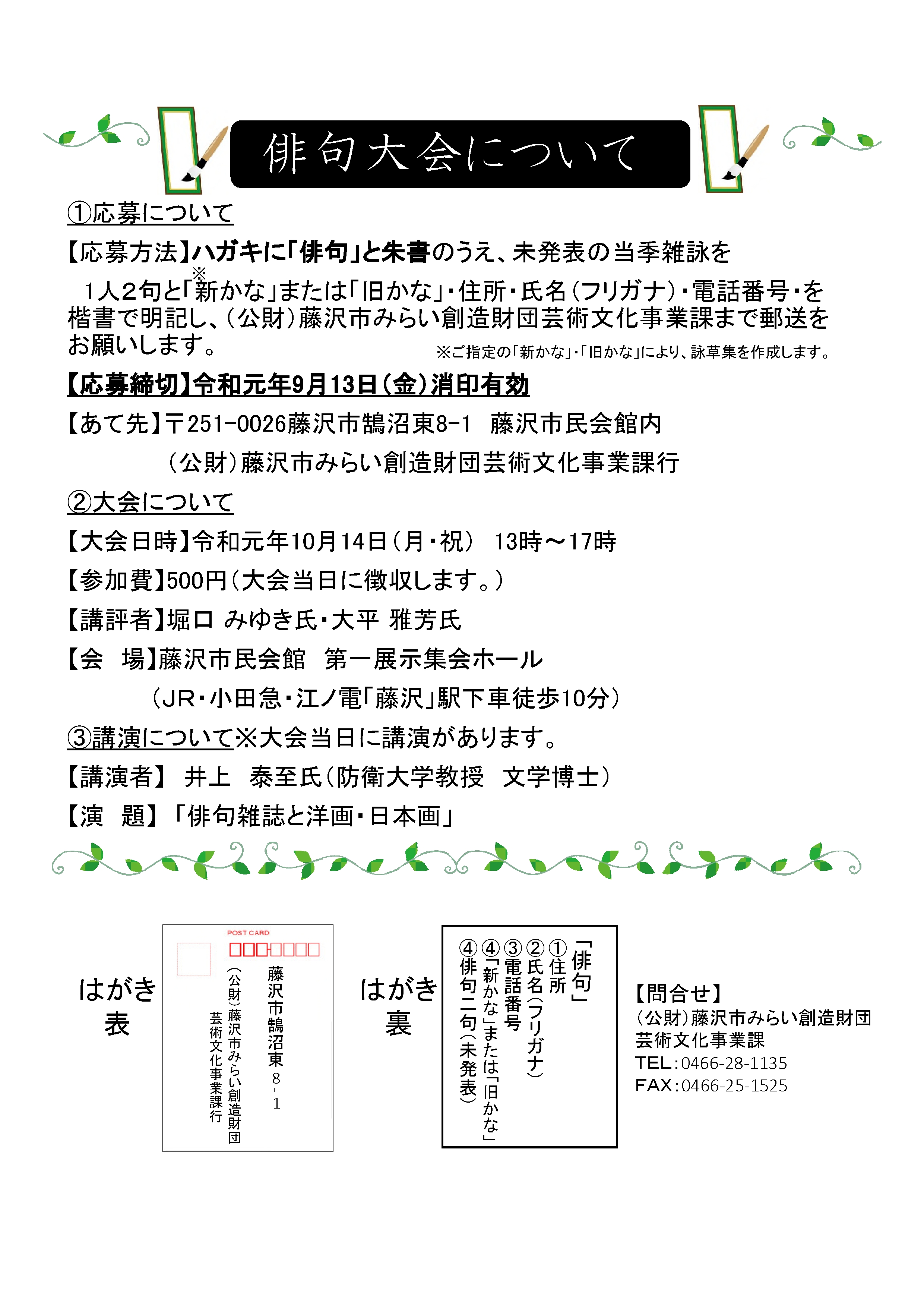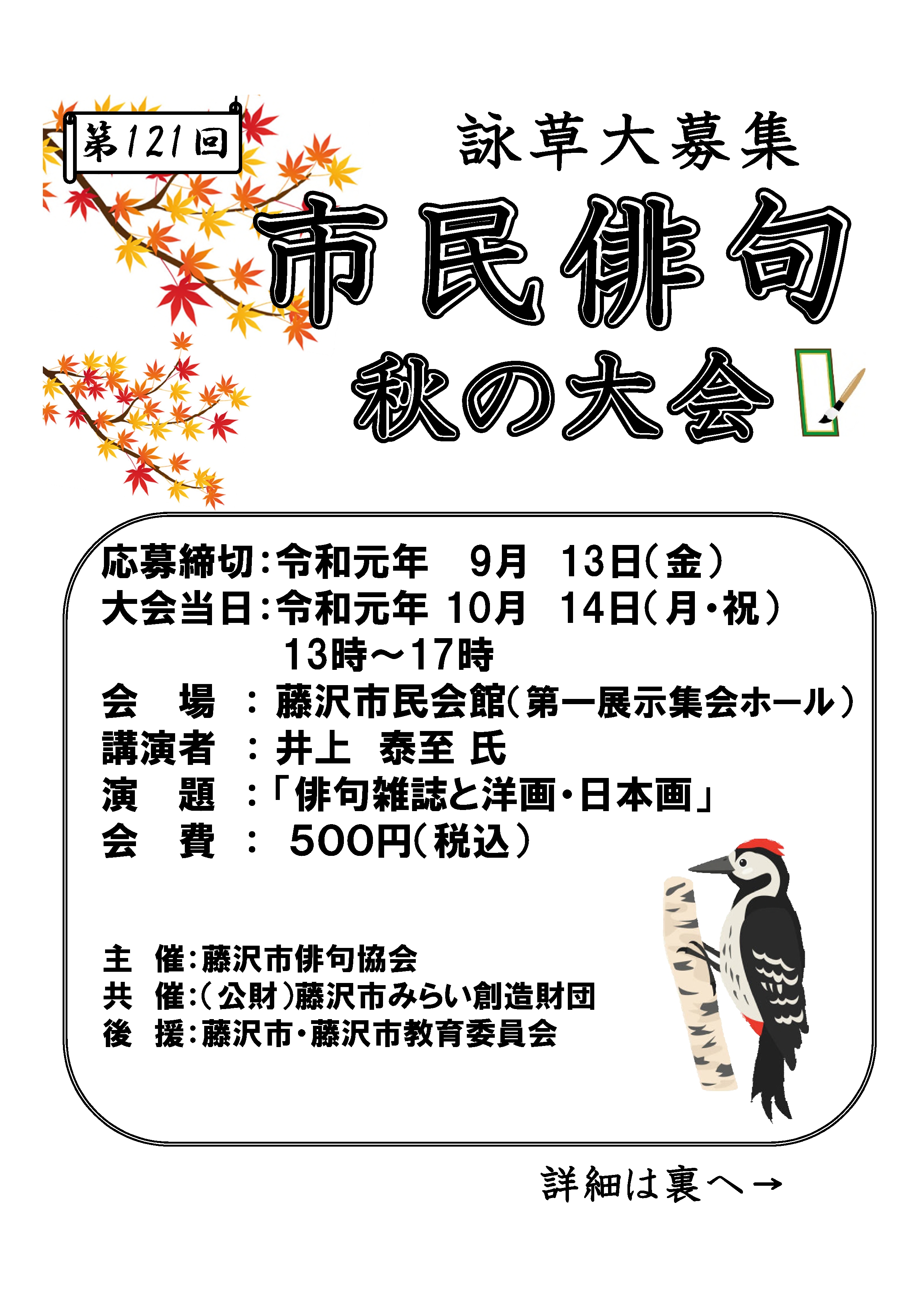 毎年恒例の市民俳句秋の大会ですが、令和元年度も開催いたします!!たくさんのご応募お待ちしております。