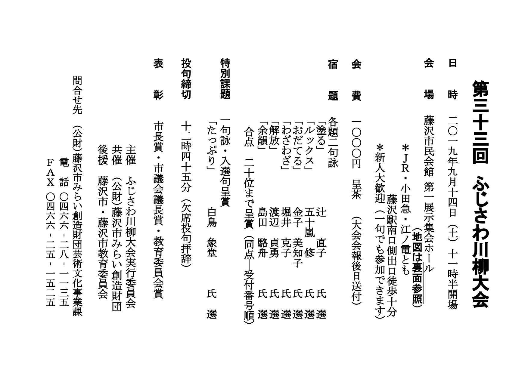 川柳の創作活動を通じて情操を豊かにし、市民文芸の推進と振興を図ることを目的に、また川柳愛好者の交流の場として、川柳大会を開催致します。一句でも参加できますので、初めての方もお気軽にお越しください。