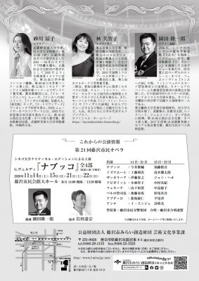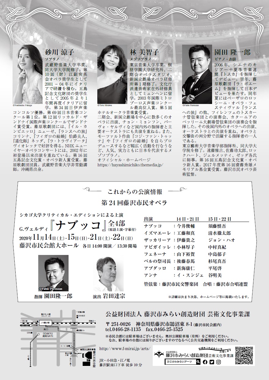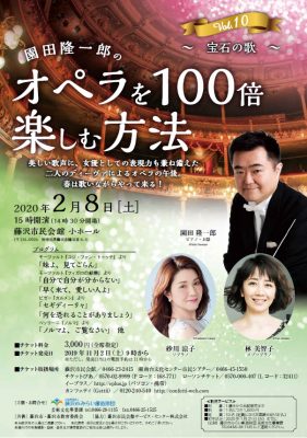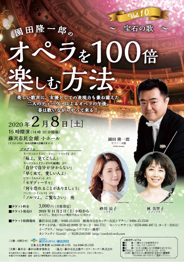 藤沢市民オペラ芸術監督で指揮者「園田隆一郎」がオペラ界大注目の歌手とともに、美しい歌声と、楽しいトークをお届けする人気シリーズ第10弾!!