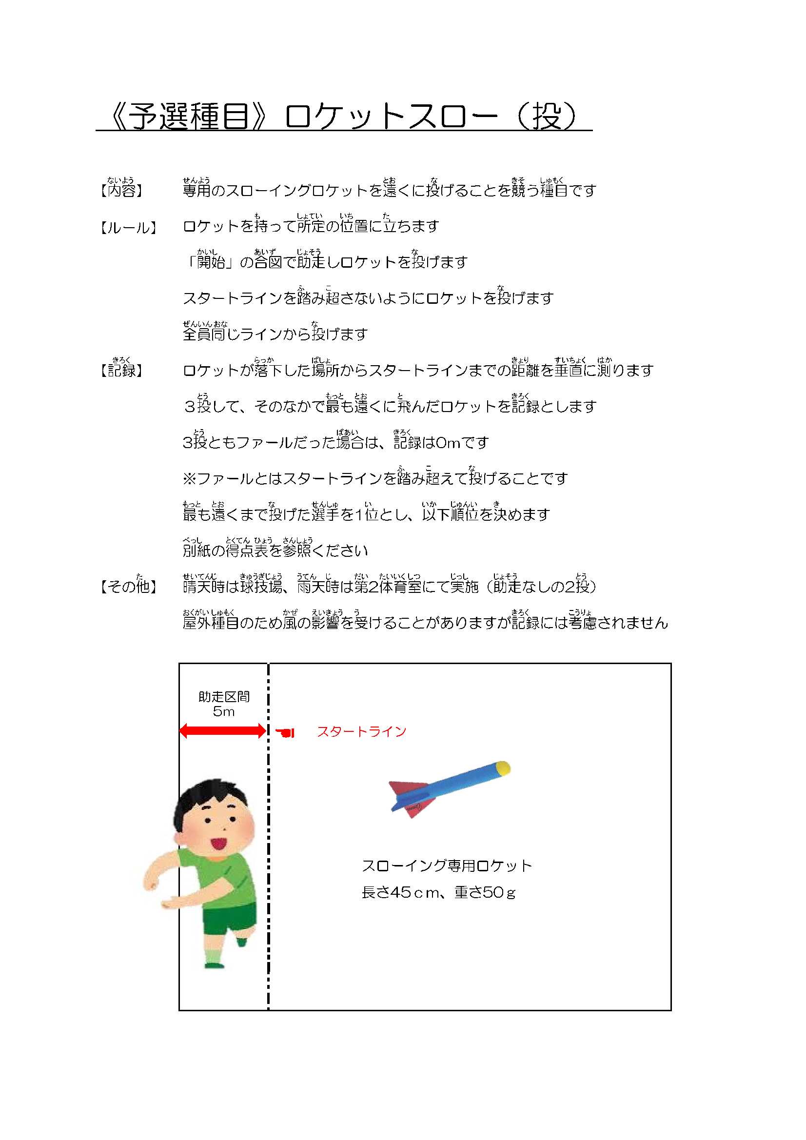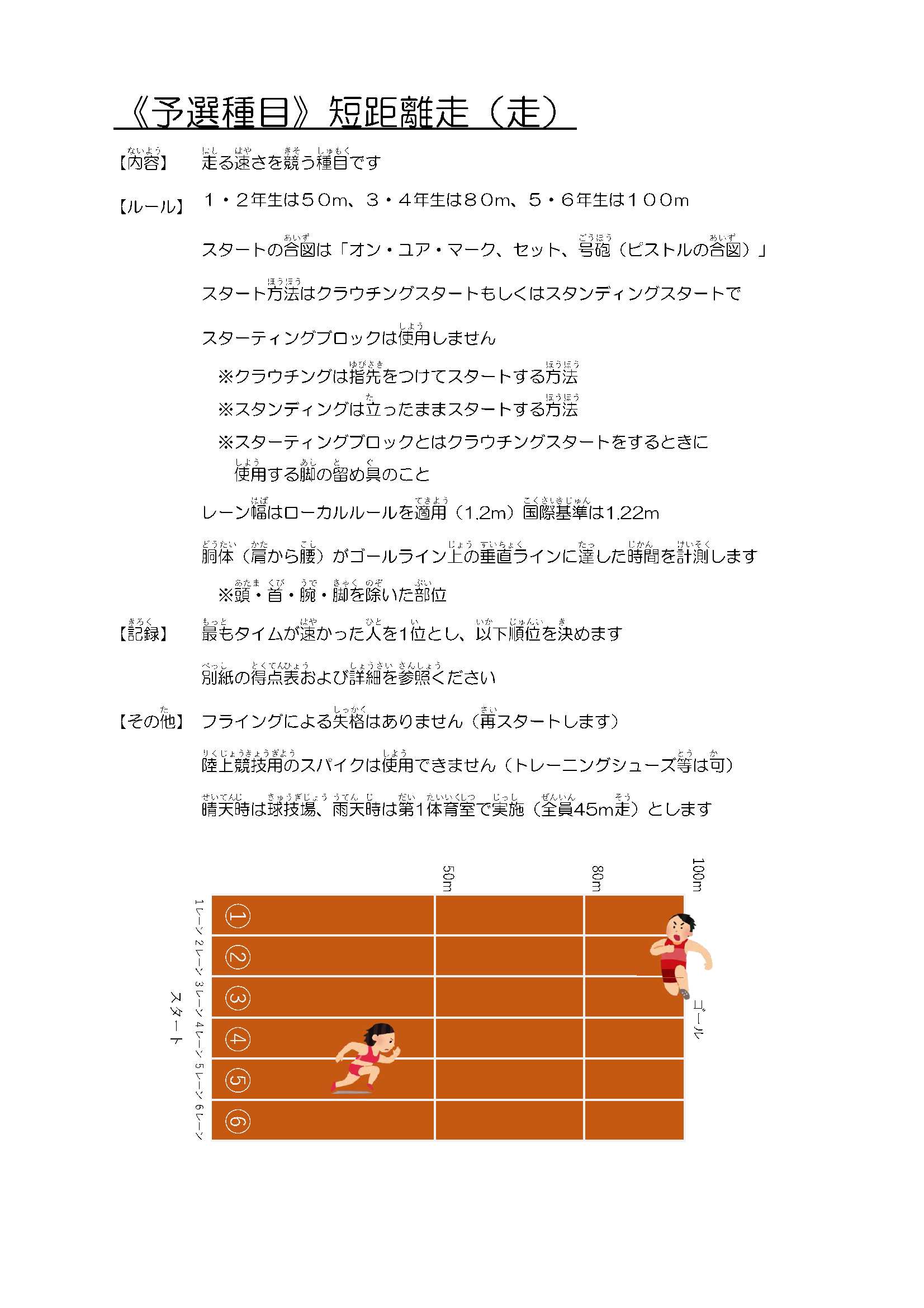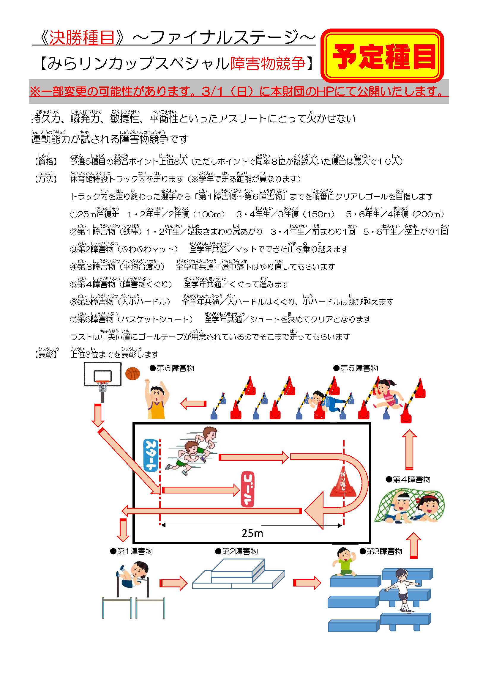 予選種目として5種目を行い、各種目順位によるポイント制で決勝に進む8人を選抜します。決勝は選抜された8人で行われ「小学生スポーツNo.1」を決定します。