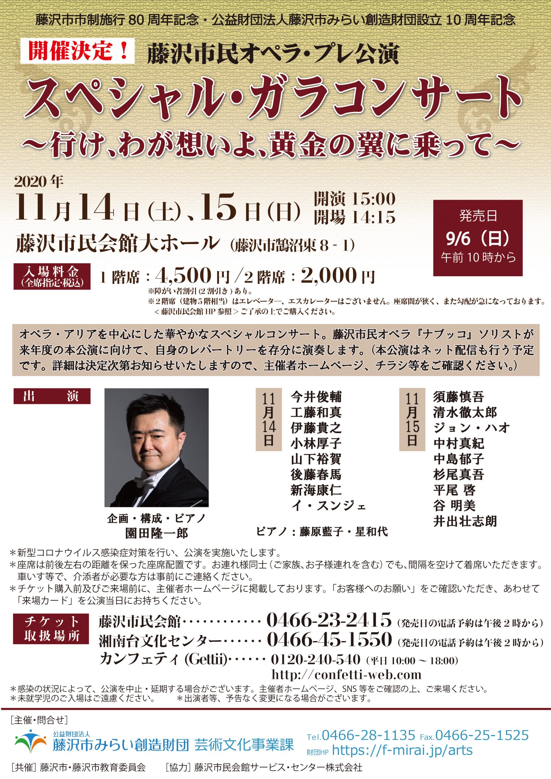 2020年11月に予定していました第24回藤沢市民オペラ「ナブッコ」は、新型コロナウイルス感染症の影響により、延期となりましたが、プレ公演として「ナブッコ」に出演予定であった、豪華ソリストによる「スペシャル・ガラコンサート」を開催いたします!