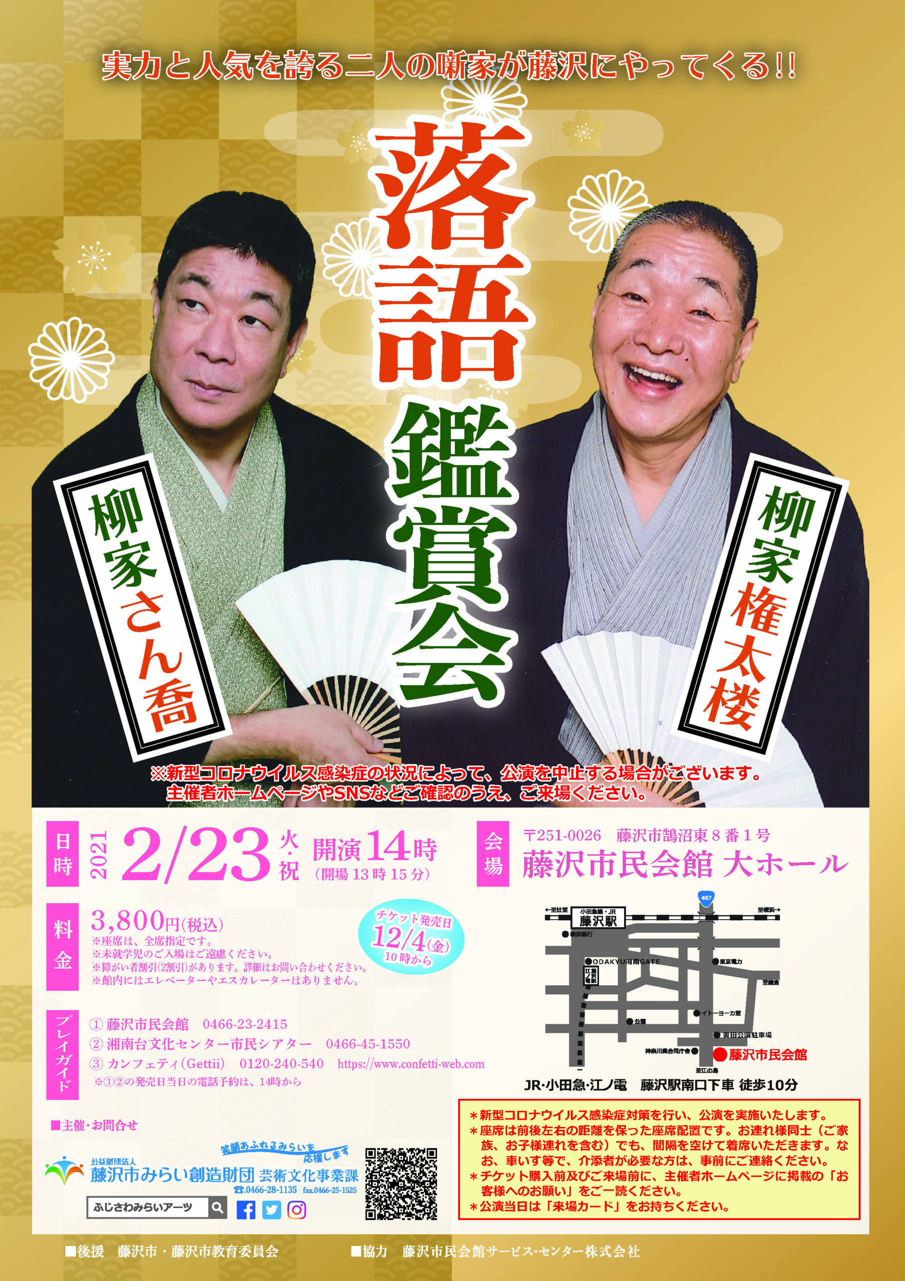 本公演は、「藤沢市民会館使用ガイドライン」に従い、座席数を減らして販売いたします。また、新型コロナウイルス感染症予防及び拡散防止のため、お客様へお願いがありますので、ご確認くださいますよう、お願い申し上げます。